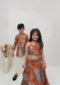 Our custom print 'Nur', featuring a charming cluster of florals, brings elegance to this flowy lehenga. Paired with a halter-neck blouse with mirror details and a matching dupatta, this set ensures your tiny trendsetter is dressed to dazzle at every occasion.