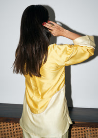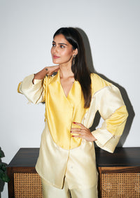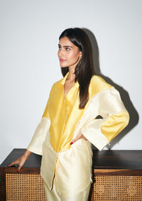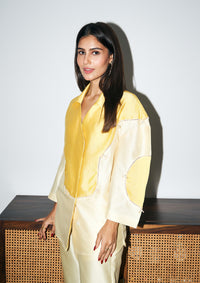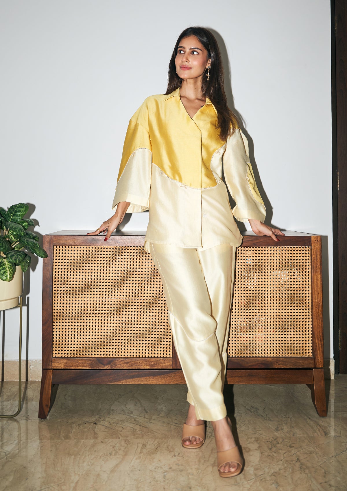 A bold blend of comfort and craft, this butter yellow co-ord set features ceramic bead and button hangings with delicate beading lace along the panel edges—adding playful charm to this striking silhouette.