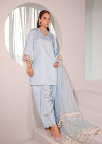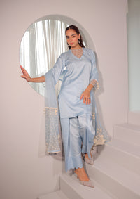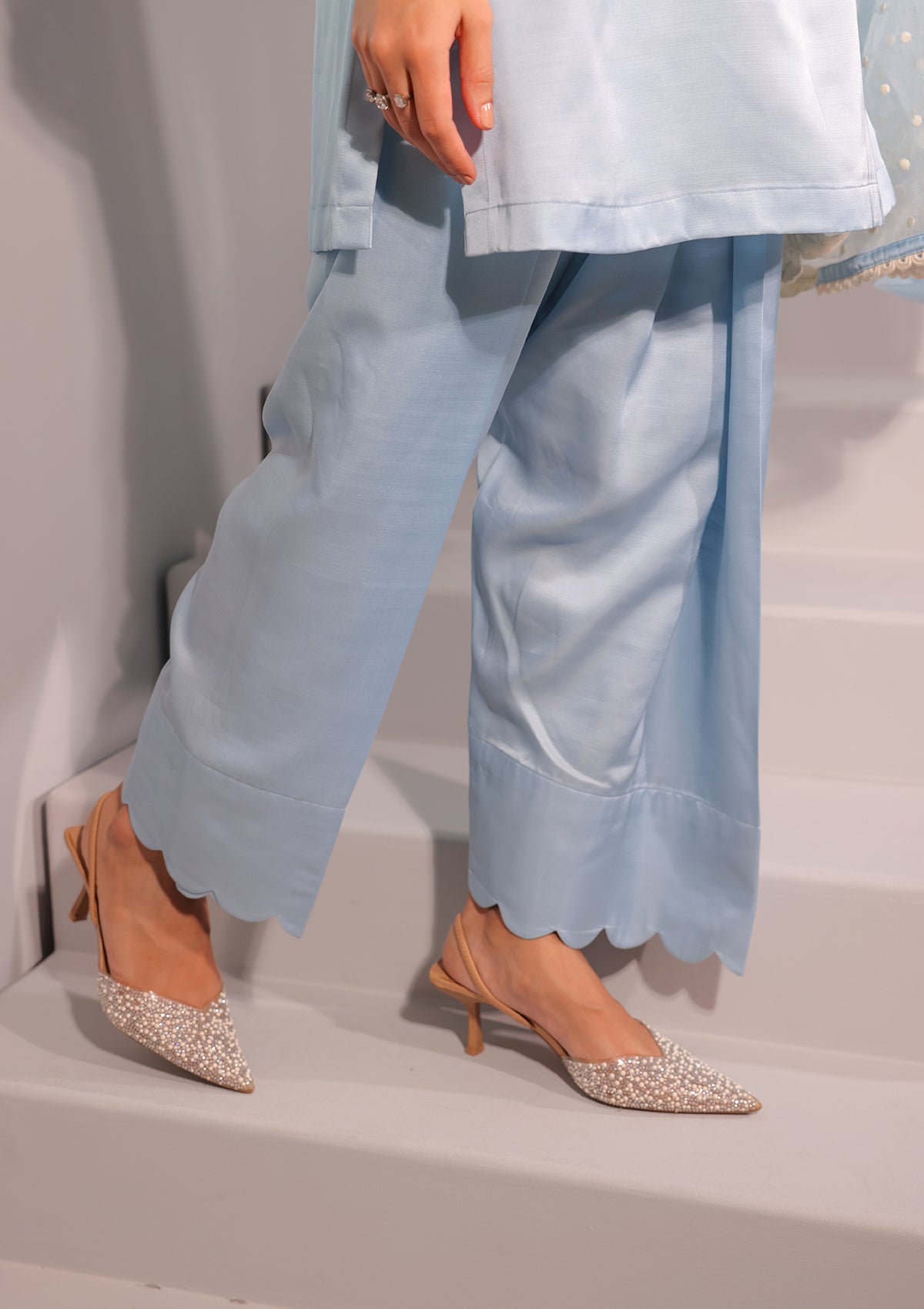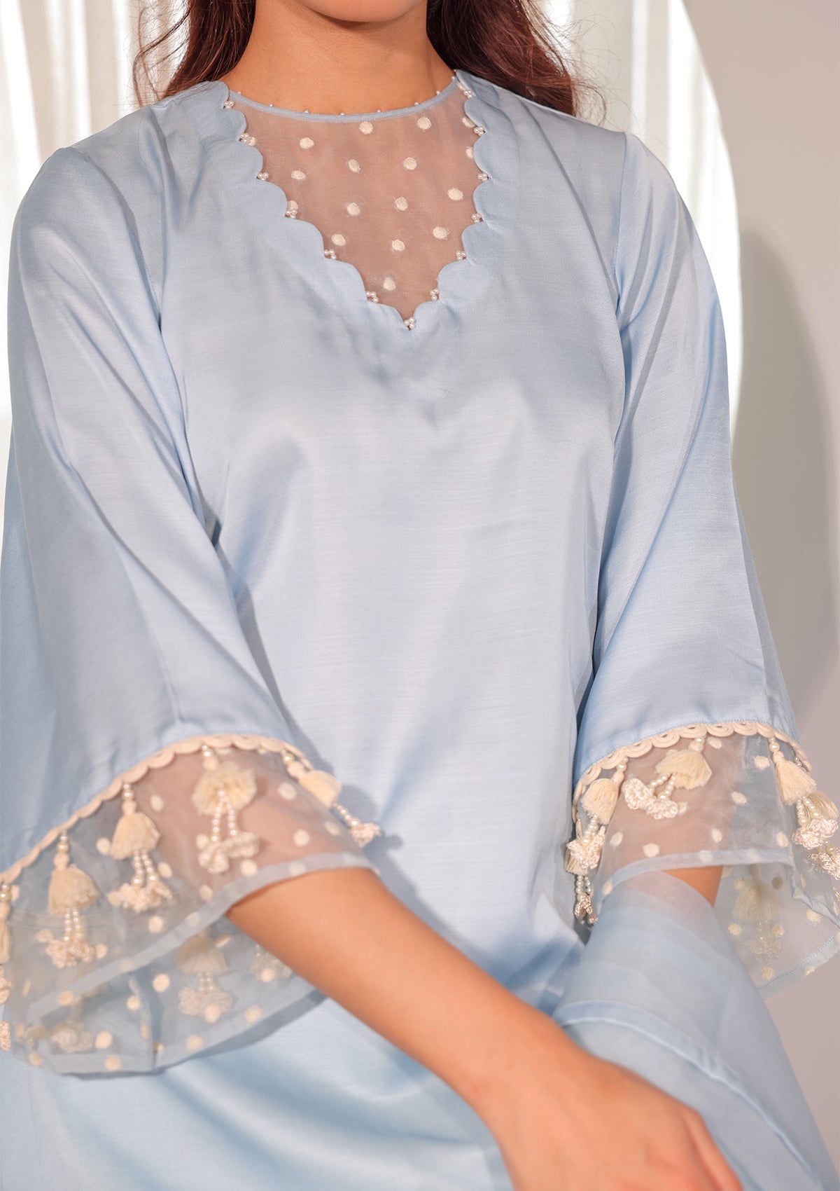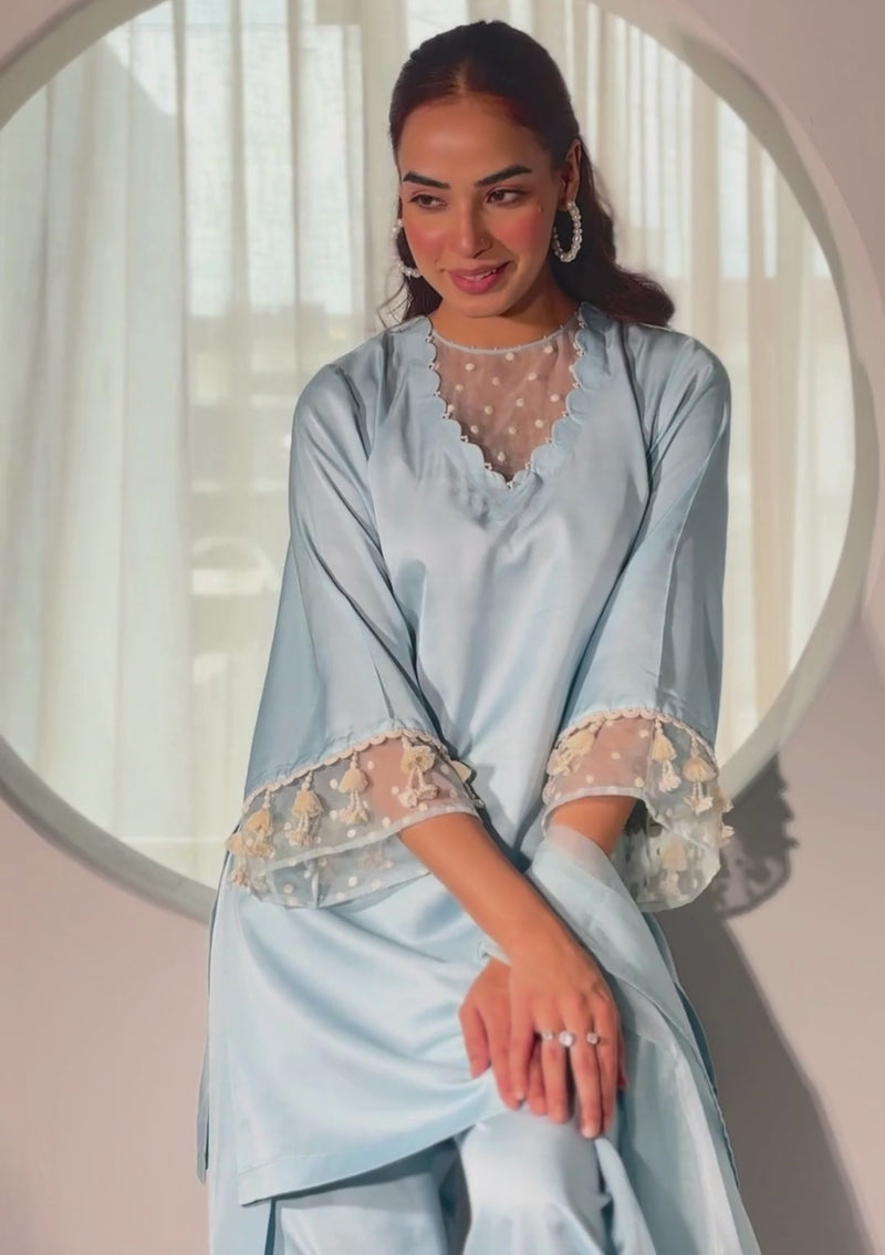 A pastel dream with delicate details, the Ice Blue Polka Farshi Set features embroidered polka dots on a sheer neckline and sleeve hems, scalloped edging, and tassel accents. The kurta is paired with a sheer organza dupatta adorned with floral appliqué and embroidered polka dots. Completing the set is a Mughal-inspired farshi salwar with a scalloped hemline, a graceful silhouette that blends tradition with subtle whimsy.