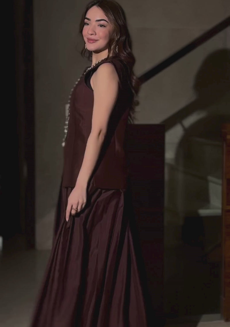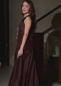 Wrapped in a warm mocha tone, the Mocha Cosmo Waistcoat Set is crafted in luxe dola silk santoon and detailed with intricate polki embroidery, finished with delicate pearl hangings. The structured waistcoat is paired with a flowing maxi skirt, creating a refined balance of modern tailoring and traditional detail. With a soft shimmer from polki and pearls, this ensemble is perfect for festive evenings, intimate gatherings, and special celebrations.
