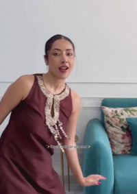 The Mocha Lucknow Farshi Salwar Set captivates in gentle silk and flowy organza. The set is masterfully embellished with zari and dori embroidery, featuring clusters of pearls and cutdana, intertwined with colorful stone and pearl hangings. The iconic farshi silhouette, known for its generous flow, brings graceful movement.